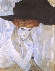 On the other hand, Black Feather Hat (Lady with Feather Hat) is somewhat different in mood and style. Our redhead beauty above looks gorgeous and vivacious like Klimt’s women usually do, but this one looks a tad different – there’s a subtle nihilism in those white-grey shades, a hint of Egon Schiele and the fin de siecle nervousness. Look at her angular face and the way her hand is painted; it looks like something you’d see on Schiele’s paintings. Truth is, Schiele was initially inspired by Klimt, but Klimt also learner something from his young independent-minded pupil. Again we see this gorgeous La Belle Epoque fashion, and again this femme fatale is looking into the distance, we don’t know what occupied her attention, or whose face lingers on her mind.