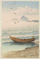 A boat being pulled onto shore at sunset. Signed: Hasui. Seal: Kawase. Publisher: Watanabe Shosaburo. Date: Showa 9 (1934).