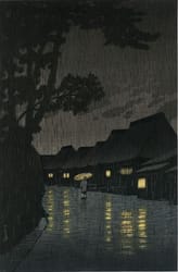 Designed in 1932 This is one of the works in “Tokaido landscape selection” consisting of 26 works (not completed). This work is night landscape raining in the course where straw-thatched houses form a line. Hasui is good at this composition such as traditional style of woodblock prints. [http://www.ukiyomokuhan.com/en/artists/hasui-kawase]