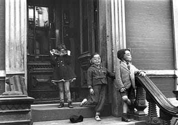 In Ms. Levitt’s best-known picture, three properly dressed children prepare to go trick-or-treating on Halloween 1939. Standing on the stoop outside their house, they are in almost metaphorical stages of readiness. The girl on the top step is putting on her mask; a boy near her, his mask in place, takes a graceful step down, while another boy, also masked, lounges on a lower step, coolly surveying the world....