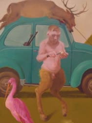 There are unusual colors and color combinations; there is the flatness of the images as though to emphasize a didactic rather than a representational purpose. As subject matter, the artist presents stories which we think we know: myths, scriptural stories and nursery rhymes. She makes use of press reports.