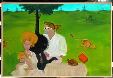 Two dogs move from the tension of this family and the ominous woman dividing them. As in other paintings, the roast chicken sits on the edge of the table, untouched and dangerously near being knocked off. The chair is knocked over. In the background is a line of windmills which could be witches and could be stakes ready for burning them.