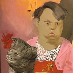 At the onset of the 1960s, Sharrer adopted some Pop art elements in her work, while continuing to cultivate her surreal subject matter. At this point, a clear visual vocabulary emerges: lap dogs, melting cutlery, lit cigarettes, and cuts of meat form a recurring motif of dreamlike symbolism, in landscapes inhabited by circus folk, mythical creatures (Leda, of swan fame, is a regular), solemn children, and round-faced, nude, frankly unapologetic women who gaze directly at the viewer.