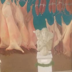 The artist was interested in the French butchers of her time in Paris. The sculpture she includes is based on the Greek work, Calf-Bearer, 560 BCE now in the Acropolis Museum, Athens.