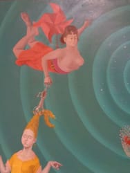 The first is that she was generally tagged as either an expressionist or a surrealist and neither of those labels fits comfortably. Some critics today call her work magical realism and though that handle has problems as well, it's closer to the mark. Surrealism is a definitional moving target, but it's hard to place Sharrer's work amidst company such as Dali, Magritte, Picasso, Tanguy, or Maher. Once you know that she was inspired by mythology, art history, nursery rhymes, and popular culture, there's nothing particularly enigmatic about her symbols or intentions. If there are other artists to whom she most compares, it's probably Paul Cadmus, or maybe Frida Kahlo in her non-figurative guise. (Kahlo was also sometimes called a surrealist and it wasn't accurate for her either.) One of Sharrer's more intriguing canvasses is titled Resurrection of the Waitress and it has odd elements such as pulled back hair, an eggbeater, a razor blade, and a bare-breasted airborne woman. But when you learn that she's telling the story of a drowning victim by riffing off a 15th century Bosch painting (Ascent of the Blessed), Sharrer's canvas is simply offbeat, not mysterious....