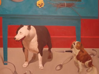 ...Throughout her work, Sharrer includes cryptic bits of personal symbolism such as cigarette butts, one-shoed figures, contorted forks, crockery, birds, and funny small dogs. And everywhere there is intense color used to sensational effect.