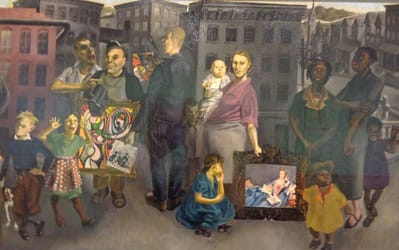 A salute to American workers, this painting shows ordinary families presenting and reacting to well-known paintings including Grant Wood’s iconic American Gothic (1930) and Pablo Picasso's Girl Before the Mirror (1932). In different ways, most of the artists Sharrer chose here, including the French realist Jean-François Millet and the Mexican muralist Diego Rivera, attempted to honor the dignity of working people. Sharrer made Workers and Paintings for a mural competition sponsored by the Springfield Art Museum, in Massachusetts. The work won an honorable mention and was included in MoMA's landmark 1946 exhibition Fourteen Americans. The ten studies were based on photographs that Sharrer adapted for the painting, a method typical of her process. Many decades later, the poet John Ashbery praised her paintings, describing their meticulous style as "a collaboration between Norman Rockwell and the brothers van Eyck." [https://www.moma.org/collection/works/78465]
