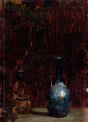 In his oriental still life painting, Pushman managed to create an atmosphere of nocturnal and contemplative intimacy through his meticulously arranged objects and their backgrounds. Pushman's concern for the objects in his paintings was of symbolic and religious importance. His oriental male and female figures represent the legends of the ancient East and Far East. They epitomize the experience of life, which implies a longing for the eternal. These small figures included the Sacred horse, the long robed statuette of a woman, a six armed Deity, the Buddha god of peace, the warrior, and the nude female figure which is emerging from her veils that are the Mystery of Life. Other special objects in Pushman's compositions were a 2000 year old iridescent glass pitcher, a lacquered chest, a teakwood box, small carved figures of saints from 13th and 14th century France and ancient Persian plates. The backgrounds usually consisted of rare centuries-old tapestries and textiles.