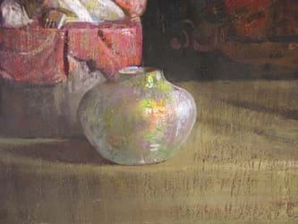 ...letter on the reverse dated November 29, 1948 from Pushman regarding the painting, "…In the center of this painting, I have placed a wooden figure of ancient Chinese origin, polychromed, clad in vermillion. Beside it, rests and iridescent vase. The figure, meditating casts a shadow over the background giving a mysterious mood to the composition. What are his past dreams?..." (https://new.liveauctioneers.com/item/8043428#&gid=1&pid=1) ...there are only a few very great examples of pure still-life painters. More often is the case that painters make still-lives to serve as “potboilers” and make a little extra cash to subsidize their true artistic passions. There are very few painters who devote their whole life to still-life painting and to the exploration of its specific problems. Hovsep Pushman is a great example of just that. The simple and pure arrangements that he paints may cause you to miss the depth of narrative and profound use paint handling. He manages to take simple objects and create mysterious narratives through their associations with the backdrop, very similar to Vermeer in “Woman Holding a Balance,” but also through more of a subliminal color association and texture created in the picture above. Perhaps the best thing is that he manages to do this without hitting you over the head with it. Sometimes paintings are so obvious that they take away the suggestive quality that makes narrative so effective. (http://www.liafa.com/hovsep-pushman-the-narrative-in-still-life/) Pushman’s artistic identity began to take shape after he opened his own studio in 1921. Robert-Fleury, upon seeing one of Pushman’s early studio still life’s, advised the artist, “That painting is you.” Thereafter, Pushman’s career was devoted to one subject, oriental mysticism, and one form, the still life. His paintings typically featured oriental idols, pottery and glassware, all glowing duskily as if illuminated by candlelight. They were symbolic, spiritual paintings, and were sometimes accompanied by readings, which help explain their allegorical significance. Most important, they were exquisitely beautiful, executed with technical precision. (http://www.hovseppushman.net/bio.html) Pushman's oriental still life painting is inherently linked to the work of the 18th century French still life painter Jean Baptiste Simeon Chardin (1699-1779). Chardin's carefully composed still life kitchen scenes included polished utensils and well worn objects which were rendered through the light and depth of their patterns and subtle relationships, expressing an undeniable spiritual bond between man and matter. Within Pushman's work it must have been remarked by those who study the art of India, China and Persia, that it presents an ever-present combination of the beautiful with the cruel or terrifying. (http://www.contemporarymasters.us/ContemporaryMasters/Hovsep_Pushman.html) ... In his oriental still life painting, Pushman managed to create an atmosphere of nocturnal and contemplative intimacy through his meticulously arranged objects and their backgrounds. Pushman's concern for the objects in his paintings was of symbolic and religious importance. His oriental male and female figures represent the legends of the ancient East and Far East. They epitomize the experience of life, which implies a longing for the eternal. These small figures included the Sacred horse, the long robed statuette of a woman, a six armed Deity, the Buddha god of peace, the warrior, and the nude female figure which is emerging from her veils that are the Mystery of Life. Other special objects in Pushman's compositions were a 2000 year old iridescent glass pitcher, a lacquered chest, a teakwood box, small carved figures of saints from 13th and 14th century France and ancient Persian plates. The backgrounds usually consisted of rare centuries-old tapestries and textiles. All these elements were combined in faultless compositions, each a unique statement vitality and meaning. mysterious charm of color is blended and interwoven in intricate and significant schemes. It pervades every one of his works, thrilling us like the play of light in the rainbow, the glitter of a serpent's scales, or the flash and fire of many jewels. He is a master of splendor and romance, a man to whom color is almost a language, at least a means of expression no less definite than the notes of the musical scale. He plays upon our emotions with color in much the same way that a musician does with sound, soothing us with exquisite harmonies, enlivening us with dramatic contrast, or melting us almost to tears with tender passages of tone, shot through with the purple of tragedy. ...The oeuvre of oriental still life paintings and prints by Hovsep Pushman is a major contribution to the history of American art and represent an equally significant achievement in the history of the still life genre. Unfortunately, many details of Pushman's life are unavailable and are closely guarded by the Pushman family. As a result, his oeuvre is relegated to a minor footnote in the most important and comprehensive book on the history of American still life painting: "American Still Life Painting" by William H. Gerdts and Russell Burke, Prager Publishers, 1971. There is, however, a forgotten document that the staff of The Illuminator rescued from obscurity, which describes Pushman's contribution to American art: "Hovsep Pushman, an American artist of Armenian birth, is an excellent craftsman and he finds in objects of the East models of form and color which he paints with rare fidelity. No American painter has equaled him in the skill and beauty with which he portrays these striking types." Immigrant Gifts to American Life, The Illuminator, Allen E. Eaten, New York, Russell Sage Foundation, 1932. (http://www.tfaoi.com/newsm1/n1m664.htm)
