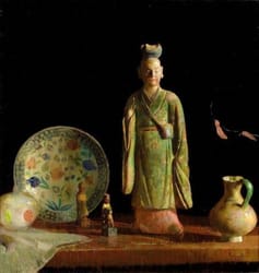 ...there are only a few very great examples of pure still life painters. More often is the case that painters make still lifes to serve as “potboilers” and make a little extra cash to subsidize their true artistic passions. There are very few painters who devote their whole life to still life painting and to the exploration of its specific problems. Hovsep Pushman is a great example of just that. The simple and pure arrangements that he paints may cause you to miss the depth of narrative and profound use paint handling. He manages to take simple objects and create mysterious narratives through their associations with the backdrop, very similar to Vermeer in “Woman Holding a Balance,” but also through more of a subliminal color association and texture created in the picture above. Perhaps the best thing is that he manages to do this without hitting you over the head with it. Sometimes paintings are so obvious that they take away the suggestive quality that makes narrative so effective. (http://www.liafa.com/hovsep-pushman-the-narrative-in-still-life/) Pushman’s artistic identity began to take shape after he opened his own studio in 1921. Robert-Fleury, upon seeing one of Pushman’s early studio still life’s, advised the artist, “That painting is you.” Thereafter, Pushman’s career was devoted to one subject, oriental mysticism, and one form, the still life. His paintings typically featured oriental idols, pottery and glassware, all glowing duskily as if illuminated by candlelight. They were symbolic, spiritual paintings, and were sometimes accompanied by readings, which help explain their allegorical significance. Most important, they were exquisitely beautiful, executed with technical precision. (http://www.hovseppushman.net/bio.html) Pushman's oriental still life painting is inherently linked to the work of the 18th century French still life painter Jean Baptiste Simeon Chardin (1699-1779). Chardin's carefully composed still life kitchen scenes included polished utensils and well worn objects which were rendered through the light and depth of their patterns and subtle relationships, expressing an undeniable spiritual bond between man and matter. Within Pushman's work it must have been remarked by those who study the art of India, China and Persia, that it presents an ever-present combination of the beautiful with the cruel or terrifying. (http://www.contemporarymasters.us/ContemporaryMasters/Hovsep_Pushman.html) In his oriental still life painting, Pushman managed to create an atmosphere of nocturnal and contemplative intimacy through his meticulously arranged objects and their backgrounds. Pushman's concern for the objects in his paintings was of symbolic and religious importance. His oriental male and female figures represent the legends of the ancient East and Far East. They epitomize the experience of life, which implies a longing for the eternal. These small figures included the Sacred horse, the long robed statuette of a woman, a six armed Deity, the Buddha god of peace, the warrior, and the nude female figure which is emerging from her veils that are the Mystery of Life. Other special objects in Pushman's compositions were a 2000 year old iridescent glass pitcher, a lacquered chest, a teakwood box, small carved figures of saints from 13th and 14th century France and ancient Persian plates. The backgrounds usually consisted of rare centuries-old tapestries and textiles. All these elements were combined in faultless compositions, each a unique statement vitality and meaning. mysterious charm of color is blended and interwoven in intricate and significant schemes. It pervades every one of his works, thrilling us like the play of light in the rainbow, the glitter of a serpent's scales, or the flash and fire of many jewels. He is a master of splendor and romance, a man to whom color is almost a language, at least a means of expression no less definite than the notes of the musical scale. He plays upon our emotions with color in much the same way that a musician does with sound, soothing us with exquisite harmonies, enlivening us with dramatic contrast, or melting us almost to tears with tender passages of tone, shot through with the purple of tragedy. ...The oeuvre of oriental still life paintings and prints by Hovsep Pushman is a major contribution to the history of American art and represent an equally significant achievement in the history of the still life genre. Unfortunately, many details of Pushman's life are unavailable and are closely guarded by the Pushman family. As a result, his oeuvre is relegated to a minor footnote in the most important and comprehensive book on the history of American still life painting: "American Still Life Painting" by William H. Gerdts and Russell Burke, Prager Publishers, 1971. There is, however, a forgotten document that the staff of The Illuminator rescued from obscurity, which describes Pushman's contribution to American art: "Hovsep Pushman, an American artist of Armenian birth, is an excellent craftsman and he finds in objects of the East models of form and color which he paints with rare fidelity. No American painter has equaled him in the skill and beauty with which he portrays these striking types." Immigrant Gifts to American Life, The Illuminator, Allen E. Eaten, New York, Russell Sage Foundation, 1932. (http://www.tfaoi.com/newsm1/n1m664.htm)