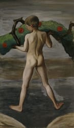 Sometimes titled "Garland of Life." "... a continuous fresco, The Garland Bearers, depicts 12 young boys carrying a garland of roses, representing the disciples of Christ carrying the vine of life. Simberg also painted a red-winged serpent of Paradise on the ceiling, sparking off considerable protest, and as late as 1946, the bishop of Tampere Diocese proposed that it be removed." (https://publicdomainreview.org/collections/the-photographs-of-hugo-simberg/)