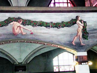 Sometimes titled "Garland of Life." "... a continuous fresco, The Garland Bearers, depicts 12 young boys carrying a garland of roses, representing the disciples of Christ carrying the vine of life. Simberg also painted a red-winged serpent of Paradise on the ceiling, sparking off considerable protest, and as late as 1946, the bishop of Tampere Diocese proposed that it be removed." (https://publicdomainreview.org/collections/the-photographs-of-hugo-simberg/)