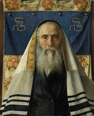 This exquisitely rendered portrait by Kaufmann captures the essence of a rabbi devoted to his faith. Pensive and solemn, the model, garbed in a conventional black silk caftan and Wolkenbruchspodek (fur hat) stands before an ornate Torah curtain, likely purchased by the artist during his many journeys to Eastern Europe. The subject's red beard and tooled covered prayer book blend with the golden hues of the work's background, creating a superbly harmonious composition. The frontal view, used most frequently by Kaufmann, places the observer's perspective slightly below the figure's composed gaze, thus enhancing the sitter's contemplative and dignified air.