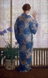 Hopkins's Bamboo Screen (ca. 1912) shows the influence of his year-long trip to the Orient in 1904-1905. The subdued palette, assymetrical design, and props are Japanese-inspired, though the sculptural delineation of the figure is more Western in nature.