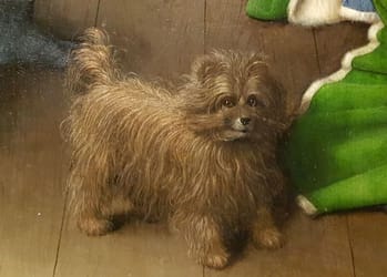 This painting is rife with symbolism, and has been called one of the most complex and original paintings in Western art history. Some say that it was painted to be a document as proof of the wedding between the man and woman. Colors and placement of figures play a large part in the symbolism of the painting as well as purposely placed objects in the room. The little dog in the foreground symbolizes fidelity, while the oranges on the chest may refer to fertility. The cast aside clogs are a traditional symbol of the wedding, and the single candle refers to the light of God. Upon close inspection of the spotless mirror in the background, you can see the reflection of the artist as well as the couple, and above the mirror is the inscription "Johannes de eyck fuit hic, 1434," translated, "Jan van Eyck was here." This painting is currently housed in The National Gallery in London, and is an oil on oak wood panel painting.