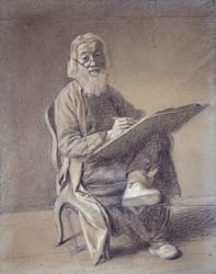 ..Liotard's time spent in the Ottoman Empire - from 1738 to 1743 - had a profound effect on his work and on his personal appearance. Much of his subsequent work, both genre scenes and portraits, feature European subjects dressed in Turkish attire, and his own very eccentric adoption of Oriental dress and a long beard earned him the nickname le peintre turc - the Turkish painter - as the inscription in another self portrait commemorates. (In 1757, at the age of 54, he made a late marriage; his new wife did not appreciate his lavish beard, and he shaved.)