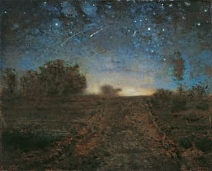ean-François Millet may have painted this work shortly after he moved to Barbizon, an artists’ colony south of Paris, in 1849. Retouched by the artist some 15 years later, Starry Night is one of Millet’s most dramatic experiments in nocturnal landscape. The composition and evocative light effects bring to mind Vincent van Gogh’s famous painting of the same title (Museum of Modern Art, New York). Van Gogh may have been influenced by this painting, which he could have seen in Paris between 1873 and 1875; his admiration of Millet’s work is well known. (http://artgallery.yale.edu/collections/objects/52945)