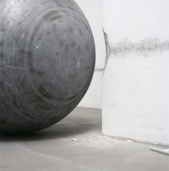 In 360° Presence, a rough steel ball starts moving when a visitor enters the space. A sensor detects physical presence and keeps the ball roaming the room as a violent manifestation. The size and weight of the ball creates a sense of hostility as it bumps into or slides along the walls. The visitor seems to have no control over or effect on the movement or direction of the ball, and is thus left without possibility to stop the aggression imposed on the space and himself.