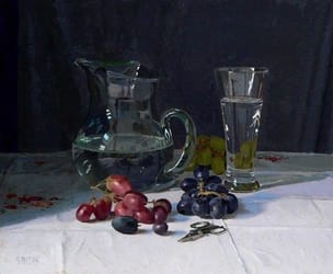My aim here was to focus on the effects of placing much of the picture's subject matter in deep shadow. The jug, glass of water and green grapes are all shaded by an unseen curtain to the left. Although we mainly see the dark backcloth through the jug, the glass surface does reflect to a small extent. On close inspection the studio and its contents (including me) can be made out dimly.