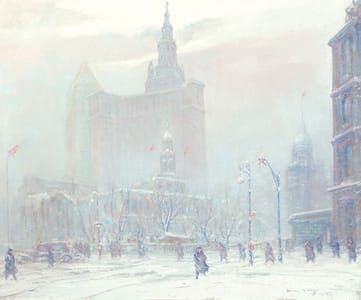 Johann Berthelsen painted New York City snow scenes again and again like he was reliving what it was like to be caught in the middle. Soaking wet. Drenched to the bone. Exhilarated and exhausted. Through daubs of color Berthelsen recreated snowy Impressionistic renderings of Washington Square, 5th Ave., the Brooklyn Bridge, Columbia University and Central Park. Berthelsen captured the whiteout atmosphere of New York City in a way few others did. He basically painted what he saw all around him. His time-specific scenes, cityscapes, cars and trucks serve as time capsules of another era in history. Studying Berthelsen’s work is difficult at times because although he signed his paintings, he rarely, if ever, dated them. That being said, it’s hard to miss this artist’s oils with their bright colors, glistening snowfalls and massive architectural backdrops. Working with small canvases, he captured big views. (http://rompedas.blogspot.nl/2010/07/late-american-impressionist.html)