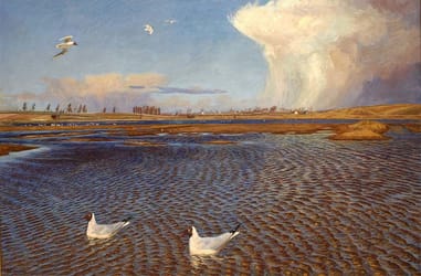 He painted birds in various habitats: in the Faaborg Museum works such as Bygevejr i April (April Shower) (1901-07) and Knortegæs. Regntykning (Brent Geese) (1908) are amongst his most important paintings.