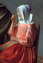 Vermeer's The Glass of Wine belongs entirely in this context. It is one of the clearest demonstrations of how he responded to the achievements of another artist. In this scene Vermeer depicted a spacious interior and set the figures back from the picture plane. Laws of linear perspective are rigidly and obviously followed. The subject of figures drinking around a table, and even the portrayal of a woman drinking from a glass, are taken from De Hooch. (http://www.johannes-vermeer.org/the-glass-of-wine.jsp)