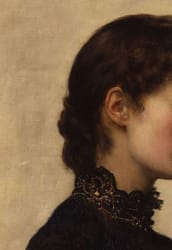 The sitter married fellow artist John Collier in 1879 and this is the second of two recorded oil portraits by him, showing Marion as a fashionable young wife. In his Sitters Book, it is listed as ‘Marion Collier, standing’ under 1883 (as with the signature) and also as having been exhibited at the Grosvenor Gallery in 1882 (as indeed it was). This inconsistency suggests that the canvas was re-worked, an inference supported by the fact that the signature and the flowers, which overlie the dress, are later additions.