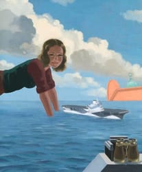 A young bespectacled woman leans into the composition from the left with her hands submerged in a water tank. The viewing-tank appears to be on the roof of a building as there is a blue sky with clouds and the green dome of a building in the background. A camouflaged model of an aircraft carrier floats on the water and a pair of binoculars sit on the edge of the tank, in the right foreground. (http://www.iwm.org.uk/collections/item/object/38913)