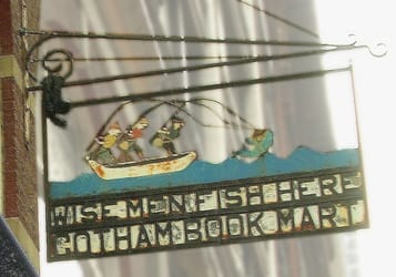 Antique 1920's used book store sign designed by John Held, Jr. hangs outside Gotham Book Mart in New York City. Says, "Wise Men Fish Here"