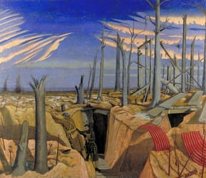 in varying shades of blue with a spectacular cloud formation framing a clear space towards the top of the composition. (https://commons.wikimedia.org/wiki/File:Oppy_Wood,_1917._Evening_Art.IWMART2243.jpg)