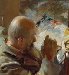 An Artist in His Studio demonstrates Sargent’s renewed commitment to producing non-commissioned work during the latter half of his career. In fact, his success as a portraitist likely helped to pave the way for the acclaim he received for the non-portrait works he often exhibited. Sargent’s independence allowed him to explore freely the artistic currents of his day, including, most importantly, Impressionism, as shown in the fluid brushwork and seemingly spontaneous nature of An Artist. The paintings Sargent produced on his travels were every bit as serious and considered as his commissioned portraits and murals, despite their picturesque and sometimes deluxe destinations. The compelling perspectives Sargent developed for them indicate their thoughtful creativity, and thus their artistic importance. In An Artist, he seems to peer over the shoulder of a friend at work. The diligent actions of Raffele, the presence of the canvas-within-a-canvas, and the lifelike palette covered with blobs of paint remind the viewer of Sargent’s presence, working like his friend at an easel propped up in the already-cramped room.