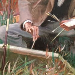 An Out‑of‑Doors Study, Sargent's portrait of his dear friend, the French painter Paul Helleu, and his wife, Alice, is a painting about the act of painting. Sargent carefully records the precise and delicate pose of Helleu's hand as he applies paint to his canvas—making it the focal point of the composition. We witness Helleu's intense concentration on the creation of his art as if it were a performance.