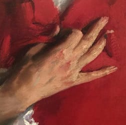In his portrait Dr. Pozzi at Home, Sargent makes the brilliant surgeon's hands the focal point of the composition. Within the dramatic crimson painting, Sargent accentuates the pale flesh of Pozzi's face and hands by framing them with the crisp, white pleated collar and cuffs of his shirt. Pozzi's slender and elegant hands remind the viewer of his profession and his renowned surgical skills. Yet his long attenuated fingers pulling at the sash and collar of his dressing gown evoke his well-known reputation as a sensualist. (https://www.metmuseum.org/exhibitions/listings/2015/sargent-portraits-of-artists-and-friends/blog/posts/sargent-portrayal-of-hands)
