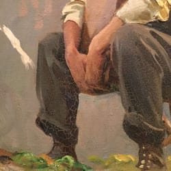 Sargent painted this portrait of Ambrogio Raffele (1845–1928) at the Simplon Pass in Switzerland. As the title suggests, Raffele, keen-sighted and inwardly ruminating, is selecting a vista to paint from the splendid alpine panorama. The picture is a tribute to an artist whom Sargent admired and whose friendship he valued. Raffele was somewhat in awe of Sargent’s celebrity, but the two became devoted companions, sharing a love of the mountains and an enthusiasm for painting outdoors. Raffele was a frequent model and also appears in An Artist in His Studio.