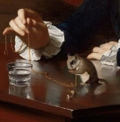 But it is not only the likeness that shows Copley’s interest in creating a showstopper. If the viewer’s eye begins at Pelham’s face and then moves downward along his right shoulder and arm, they would next notice Pelham’s brightly illuminated (particularly against the dark base of the column) right hand that delicately holds a meticulously painted gold chain. Pelham grasps it between his thumb and index finger, and it runs atop his hand, falling to the underside of his palm, and then is delicately laid atop his pinky. The oval of the end of the chain mirrors the ovals present in the glass of water underneath his hand. And this gold chain leads the eyes rightward towards a pet flying squirrel that nibbles on the meat of a recently cracked nut.