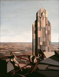 Sage rejected the vibrant color palette and mind-bending imagery favored by many of the Surrealist painters, choosing instead to compose muted canvases that toe the line between realism and fantasy. In Men Working, a peculiar skyscraper stands sentinel before a vast, patchwork plain. Separating a seemingly abandoned urban setting and a barren rural landscape, the ominous building suggests a transition from the known to the unknown, though the artist does not divulge which might be more perilous. Like many of Sage's paintings, Men Working merely hints at the one-time presence of humans, displaying the detritus of lived experience as evidence. In portraying haunting worlds that leave interpretation in the viewer's hands, sage draws on the mind's capacity to blur the distinction between what is real and what is imagined.