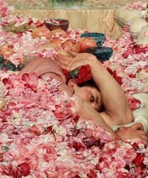 This is one of his most famous paintings. It depicts the Roman Emperor Egabalus (Heliogabalus), a debauched psychotic. In this episode, he is attempting to smother his unsuspecting audience with rose petals, which have been let loose from false ceiling panels. Alma-Tadema wanted each petal to be as perfectly realistic as possible, and had shipments of rose petals sent to him from the Riviera over the winter of 1887-1888, so he would have fresh examples.