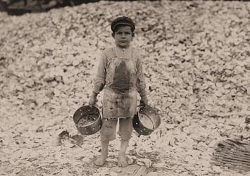 Seafood Workers: "Manuel the young shrimp picker, age 5, and a mountain of child labor oyster shells behind him. He worked last year. Understands not a word of English. Biloxi, Mississippi." Original photo caption by Lewish W. Hine. http://www.historyplace.com/unitedstates/childlabor/hine-manuel.htm