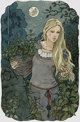 "...But when she began the seventh she found she had no more flax. She knew that the nettles she wanted to use grew in the churchyard, and that she must pluck them herself. How should she get out there? 'Oh, what is the pain in my fingers to the torment which my heart endures?' said she. 'I must venture, I shall not be denied help from heaven.' Then with a trembling heart, as if she were about to perform a wicked deed, she crept into the garden in the broad moonlight, and passed through the narrow walks and the deserted streets, till she reached the churchyard..." — H.C. Andersen, "The Wild Swans"