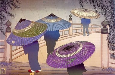 Alternate titles: Fujiyama Amid Clouds; and Shoji, Fujiyama With artist's monogram LMM within the composition at lower left, and signed in ink, Lilian Miller 1928. Titled in pencil on the bottom margin, "Rain Blossoms" - Japan. Self-carved and very likely self-printed by the artist, ca. 1928. [https://www.scholten-japanese-art.com/japanese_prints_3-19.htm] In Rain Blossoms that Miler made in 1928, the colorful umbrellas, or 'blossoms', are contrasted against the plain background of the people's bodies. Willow trees and the bridge are traditional Oriental motifs. It is considered a "beautiful example of Miller's work". [https://en.wikipedia.org/wiki/Lilian_May_Miller]