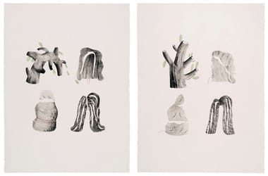 The Artifact drawings involve pairs of anthropomorphized forms investigating how two related images placed side by side will imply time and change, inviting narrative interpretation. Carré is interested how people read the space between two similar images or objects and these drawings are inspired by clay objects that she created, as well as some attempted to make but failed. The drawings reflect on the lack of control over the object in both its creation and its interpretation over time.