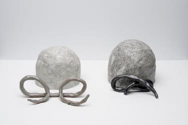 The ceramic sculptures in Lilli Carré’s series “Conversations in Held Poses,” much like her work in comics, animation, and drawing, explore narrative and the development of character (whether figurative or abstracted) through sequence. Displayed in grouped pairings, the sculptures are seemingly engaged in conversation with one another—as well as with an accompanying series of works on paper, called “Artifacts”. Carré is interested in the sense of time that is created when two similar objects are placed side by side, and describes the space both between these sculptures and the resonant two-dimensional drawings as being as much a part of the work as the art objects themselves. This interstitial space possesses a kind of life force, perhaps representing the coexistence of before and after; we experience the presence of the pieces in relationship to one another just as we fill up the absence in between them with our own narratives. This piece was first exhibited at Chicago’s Museum of Contemporary Art in a solo show from December 17, 2013 to April 15, 2014.