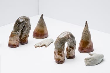 The ceramic sculptures in Lilli Carré’s series “Conversations in Held Poses,” much like her work in comics, animation, and drawing, explore narrative and the development of character (whether figurative or abstracted) through sequence. Displayed in grouped pairings, the sculptures are seemingly engaged in conversation with one another—as well as with an accompanying series of works on paper, called “Artifacts”. Carré is interested in the sense of time that is created when two similar objects are placed side by side, and describes the space both between these sculptures and the resonant two-dimensional drawings as being as much a part of the work as the art objects themselves. This interstitial space possesses a kind of life force, perhaps representing the coexistence of before and after; we experience the presence of the pieces in relationship to one another just as we fill up the absence in between them with our own narratives. This piece was first exhibited at Chicago’s Museum of Contemporary Art in a solo show from December 17, 2013 to April 15, 2014.