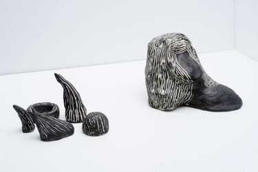 The ceramic sculptures in Lilli Carré’s series “Conversations in Held Poses,” much like her work in comics, animation, and drawing, explore narrative and the development of character (whether figurative or abstracted) through sequence. Displayed in grouped pairings, the sculptures are seemingly engaged in conversation with one another—as well as with an accompanying series of works on paper, called “Artifacts”. Carré is interested in the sense of time that is created when two similar objects are placed side by side, and describes the space both between these sculptures and the resonant two-dimensional drawings as being as much a part of the work as the art objects themselves. This interstitial space possesses a kind of life force, perhaps representing the coexistence of before and after; we experience the presence of the pieces in relationship to one another just as we fill up the absence in between them with our own narratives. This piece was first exhibited at Chicago’s Museum of Contemporary Art in a solo show from December 17, 2013 to April 15, 2014.
