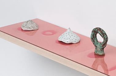 6 small glazed ceramic pieces on UV glass on construction paper on wood