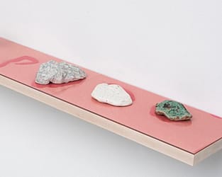 6 small glazed ceramic pieces on UV glass on construction paper on wood