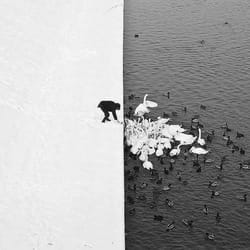 A Man Feeding Swans in the Snow
