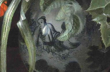 Flower Arrangement in a Vase with Figures on it and an Orange