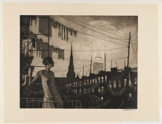 American artist Martin Lewis was known for his drypoint etchings that captured street life in New York. In this work, Lewis depicts the drastic contrast of lifestyles that existed in the city during this period. While it was a decade known for its lavish style and prosperity, there were still many people living in gritty buildings who could only admire the glamour from afar. Here, Lewis depicts a woman on a fire escape amongst dark, squat buildings and hanging laundry, gazing at Manhattan’s Chanin Building glowing in the distance. (https://theculturetrip.com/north-america/usa/new-york/articles/10-artworks-that-capture-nyc-in-the-1920s/)