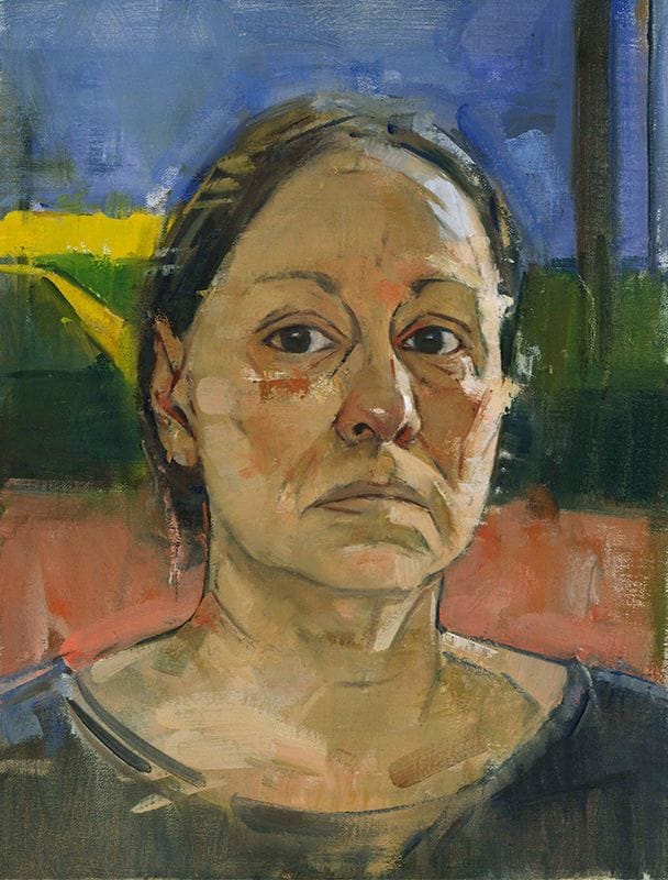 Contemporary figurative painter Mary Beth McKenzie has returned again and again to the theme of the self portrait over the years, including many examples of the working self portrait. Far from being symptoms of vanity, we see the painter gazing unflinchingly into the mirror, noting and accepting the bodily changes wrought by time.